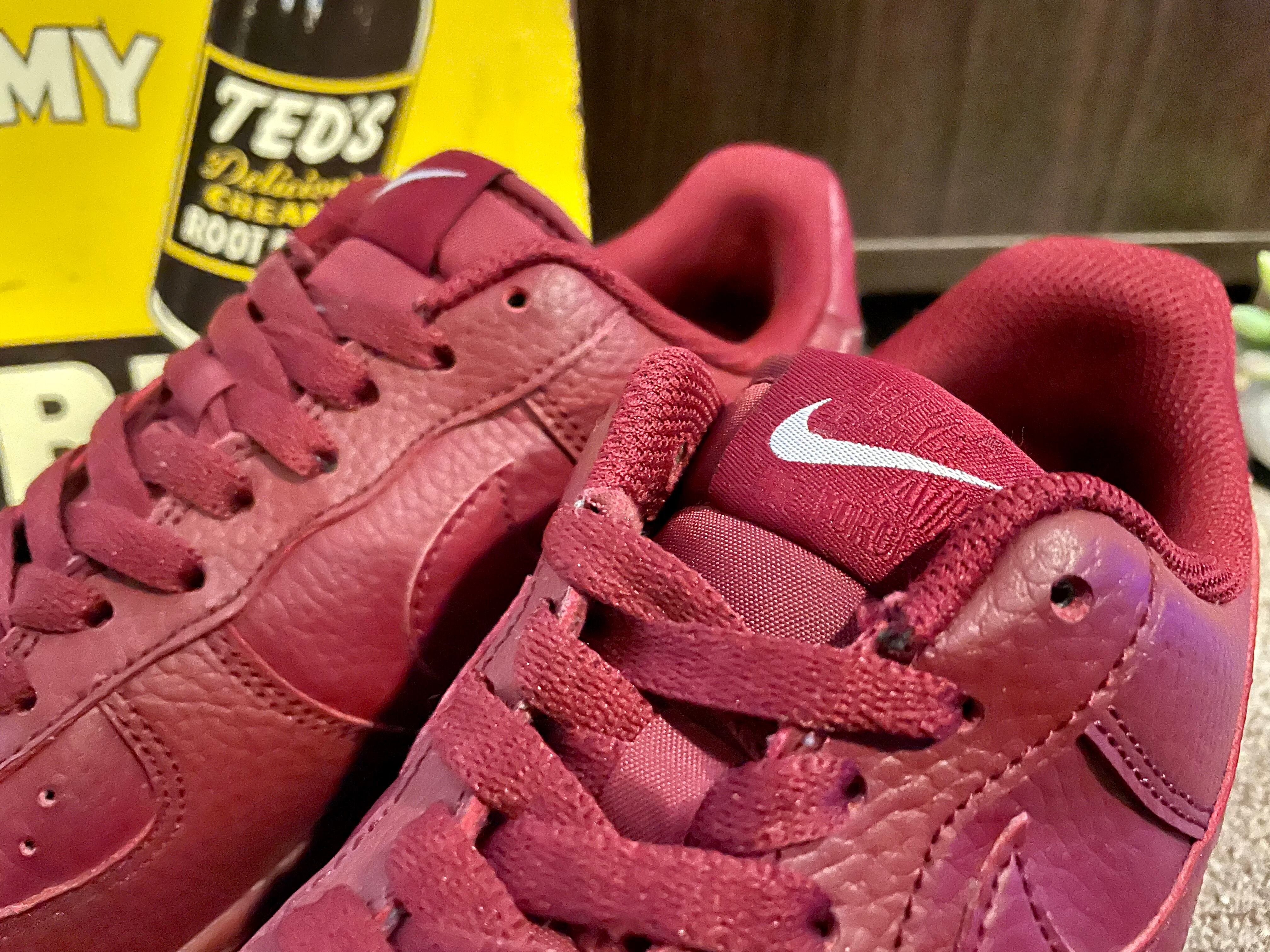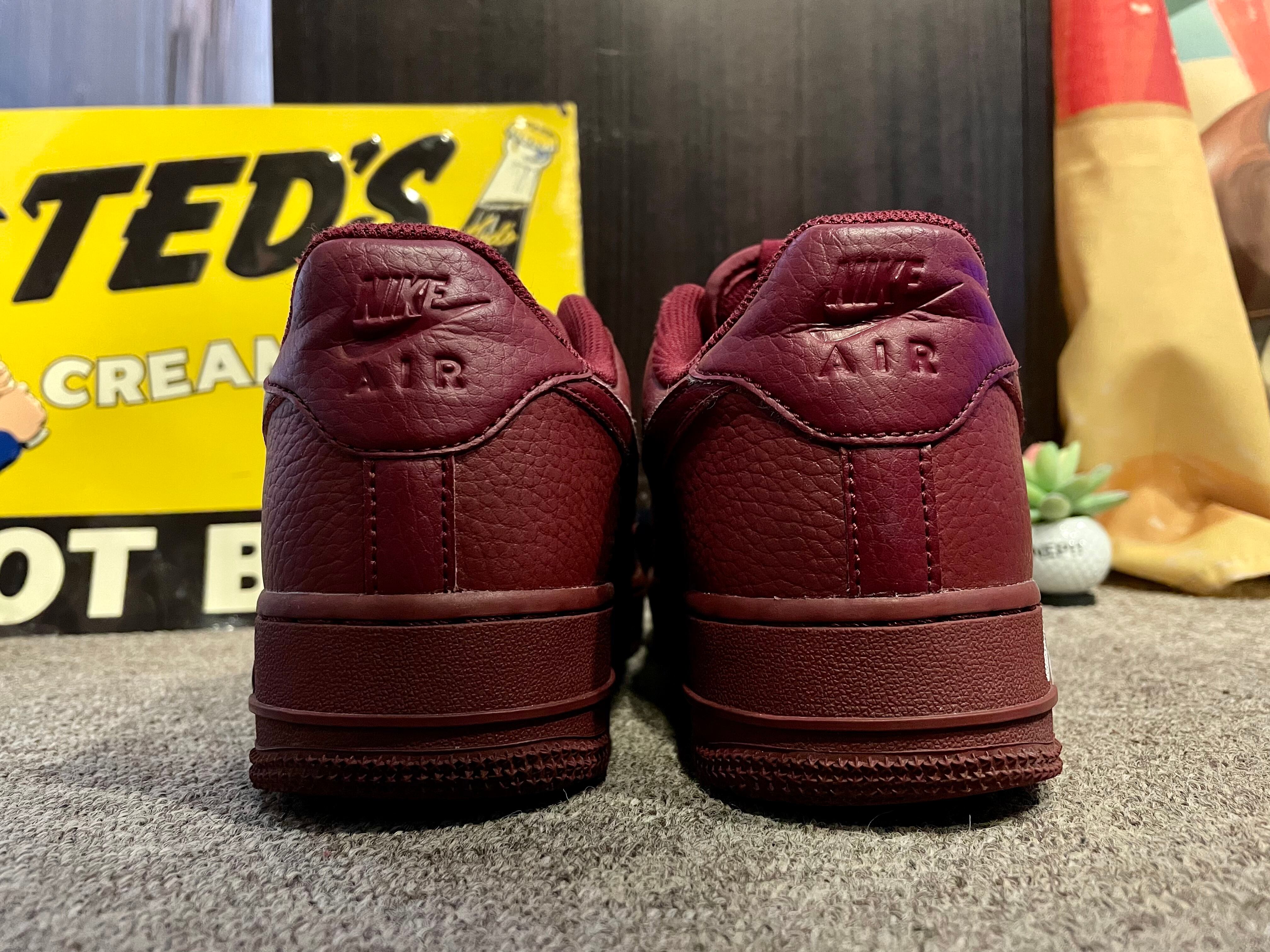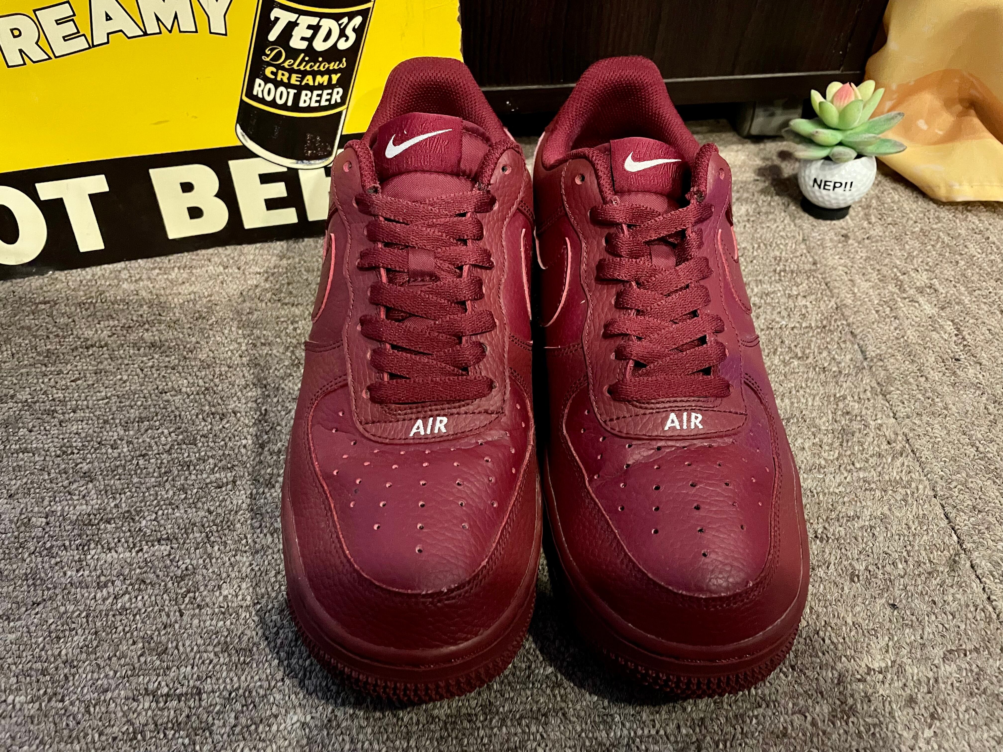 ワインレッドのレザーのエアフォース1です。ソールまで同色で、ヒールのサイドには『NIKE』のロゴも入ります。
