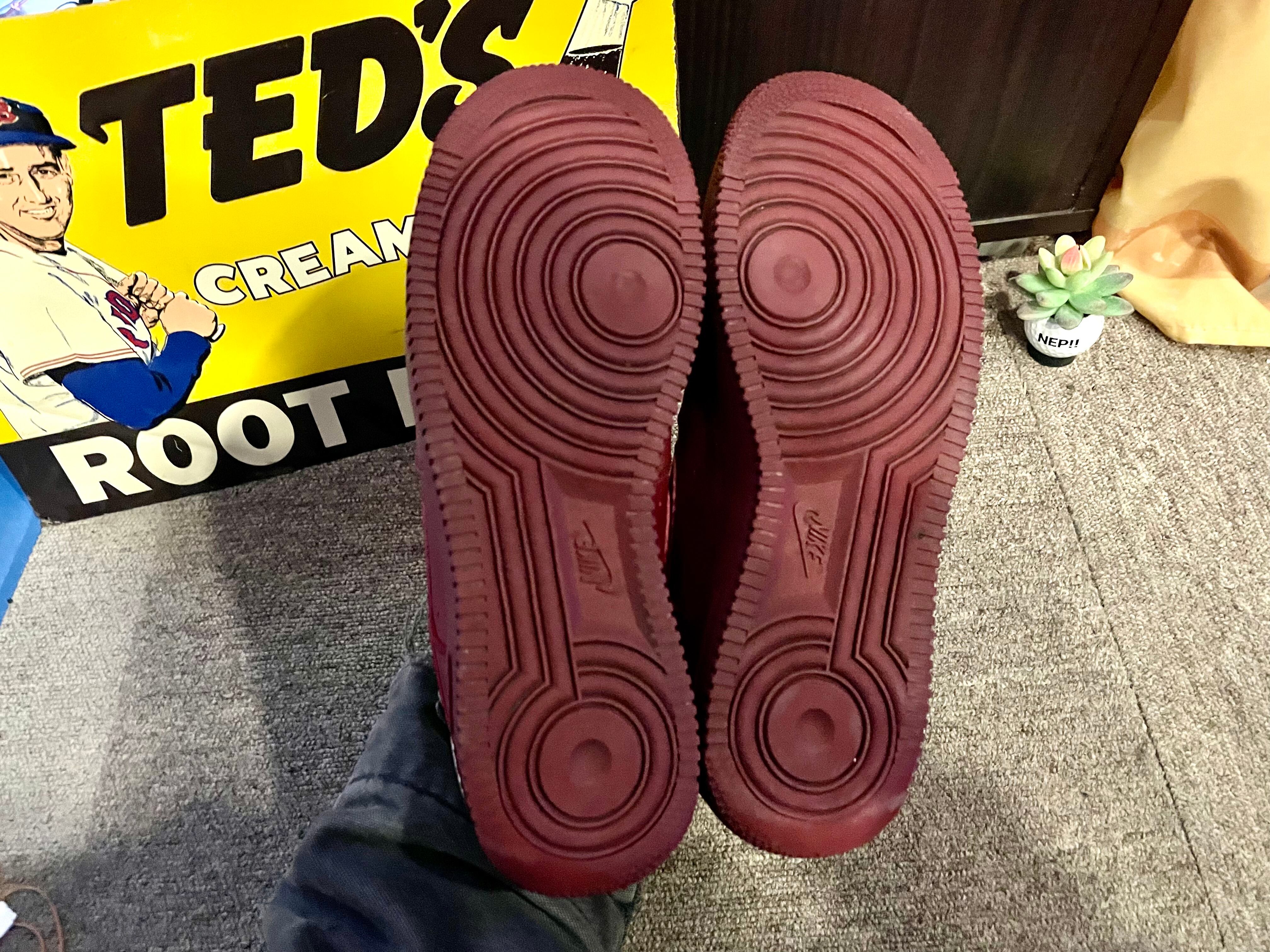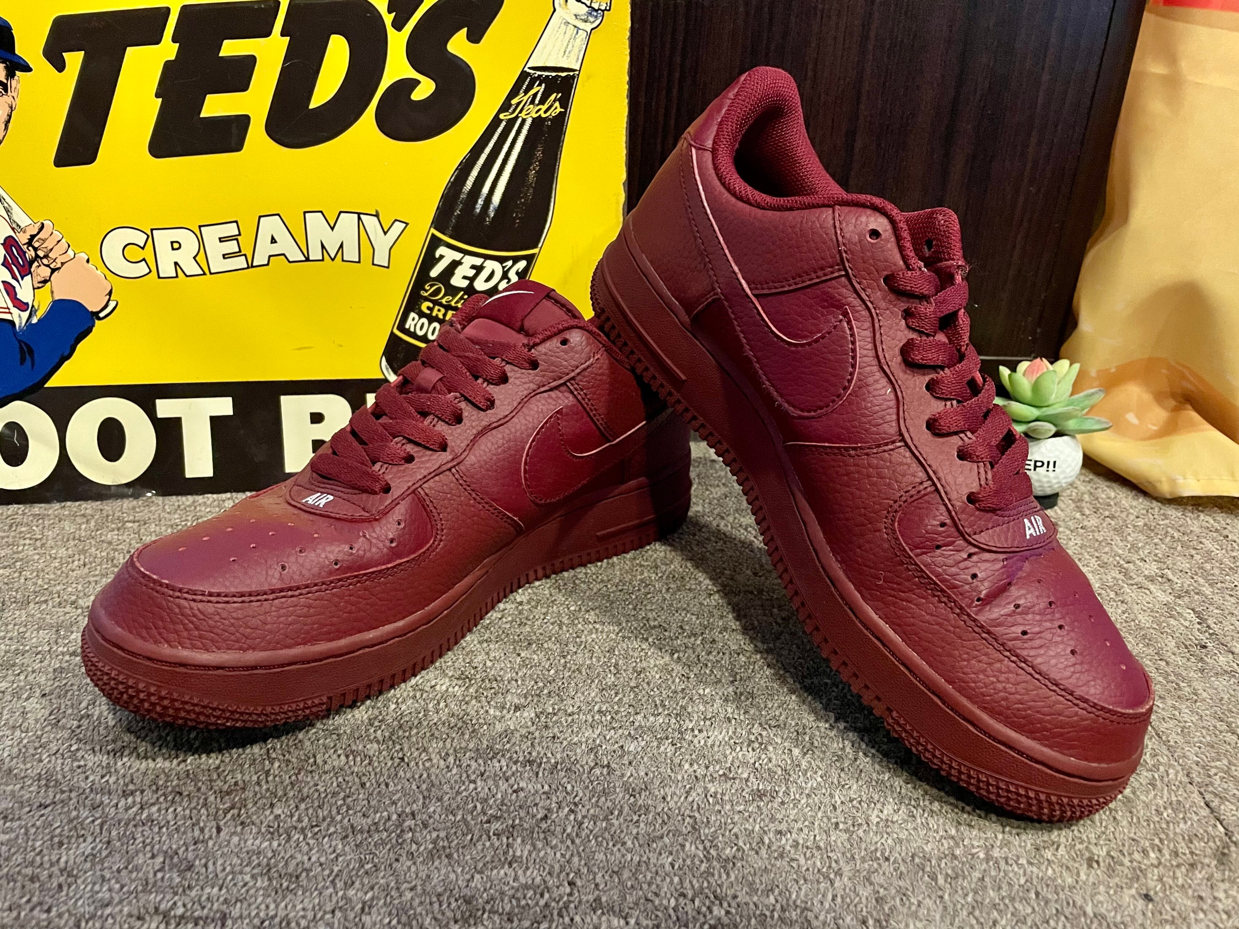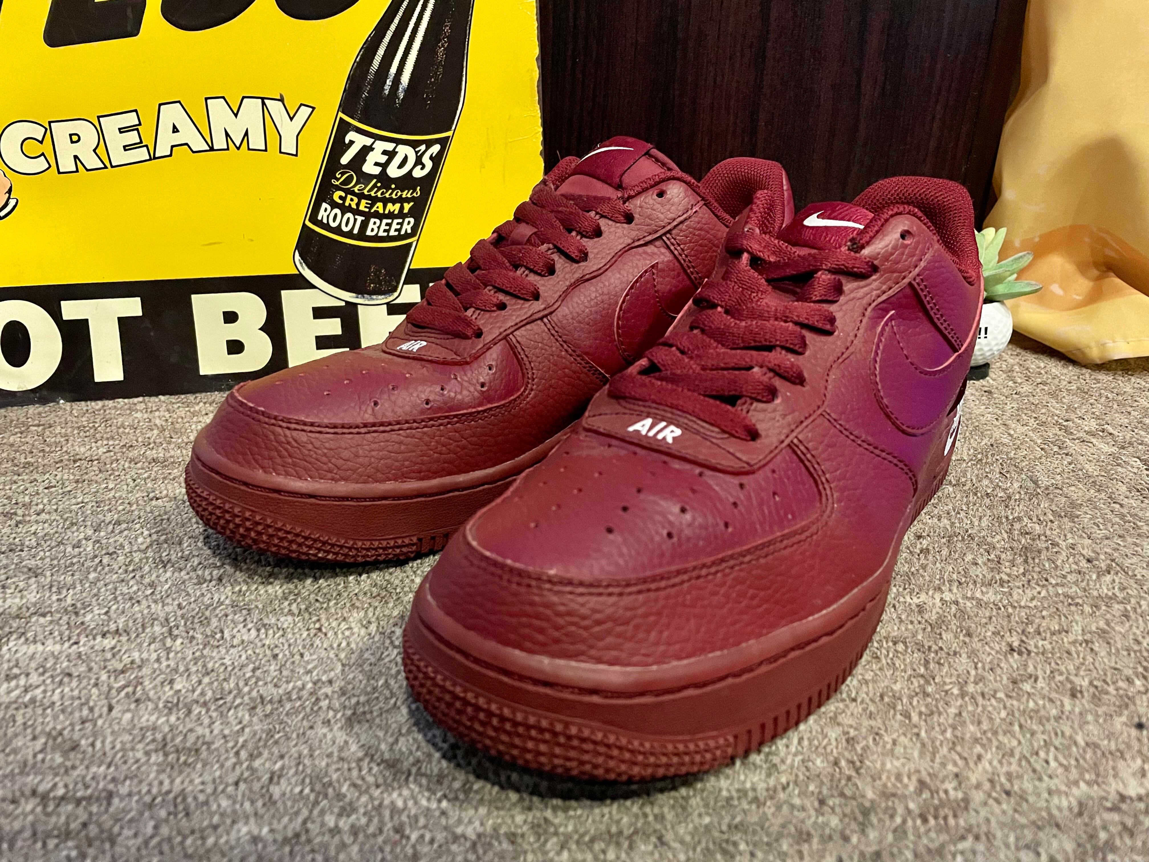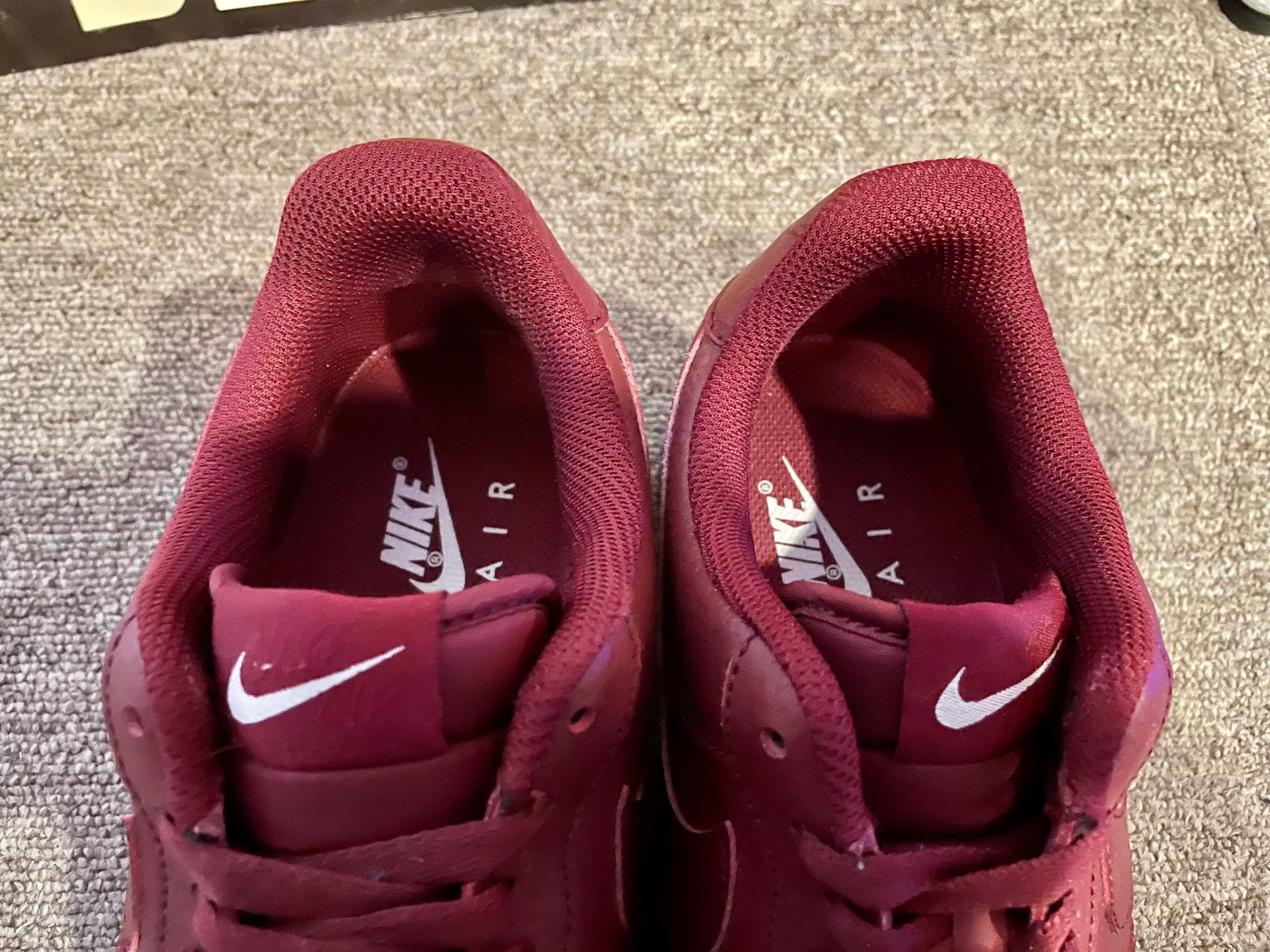 ワインレッドのレザーのエアフォース1です。ソールまで同色で、ヒールのサイドには『NIKE』のロゴも入ります。