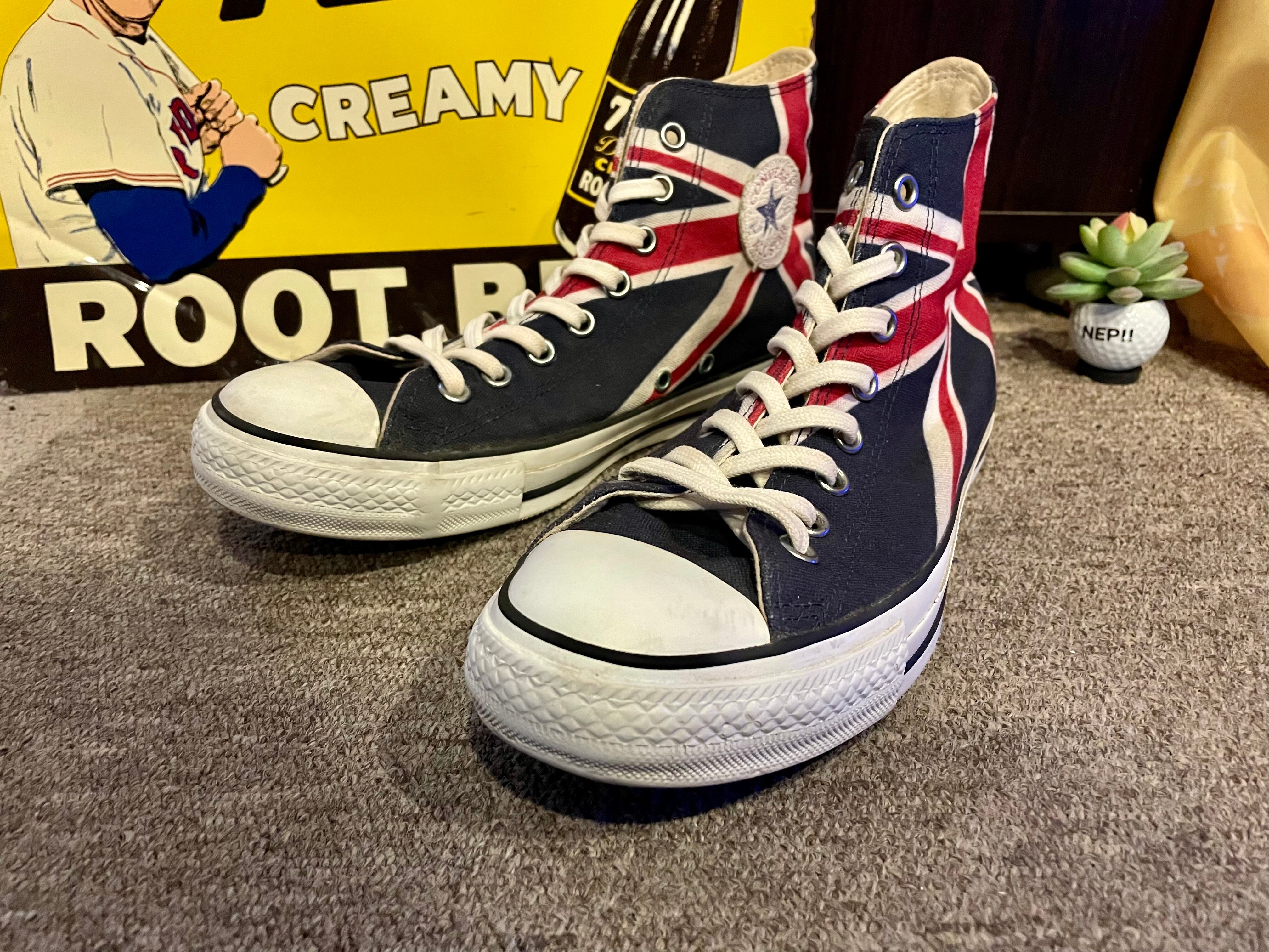 17年前に発売されたユニオンジャックのコンバースです。アッパーに大胆にユニオンジャックがプリントされており、人気の国旗シリーズです。