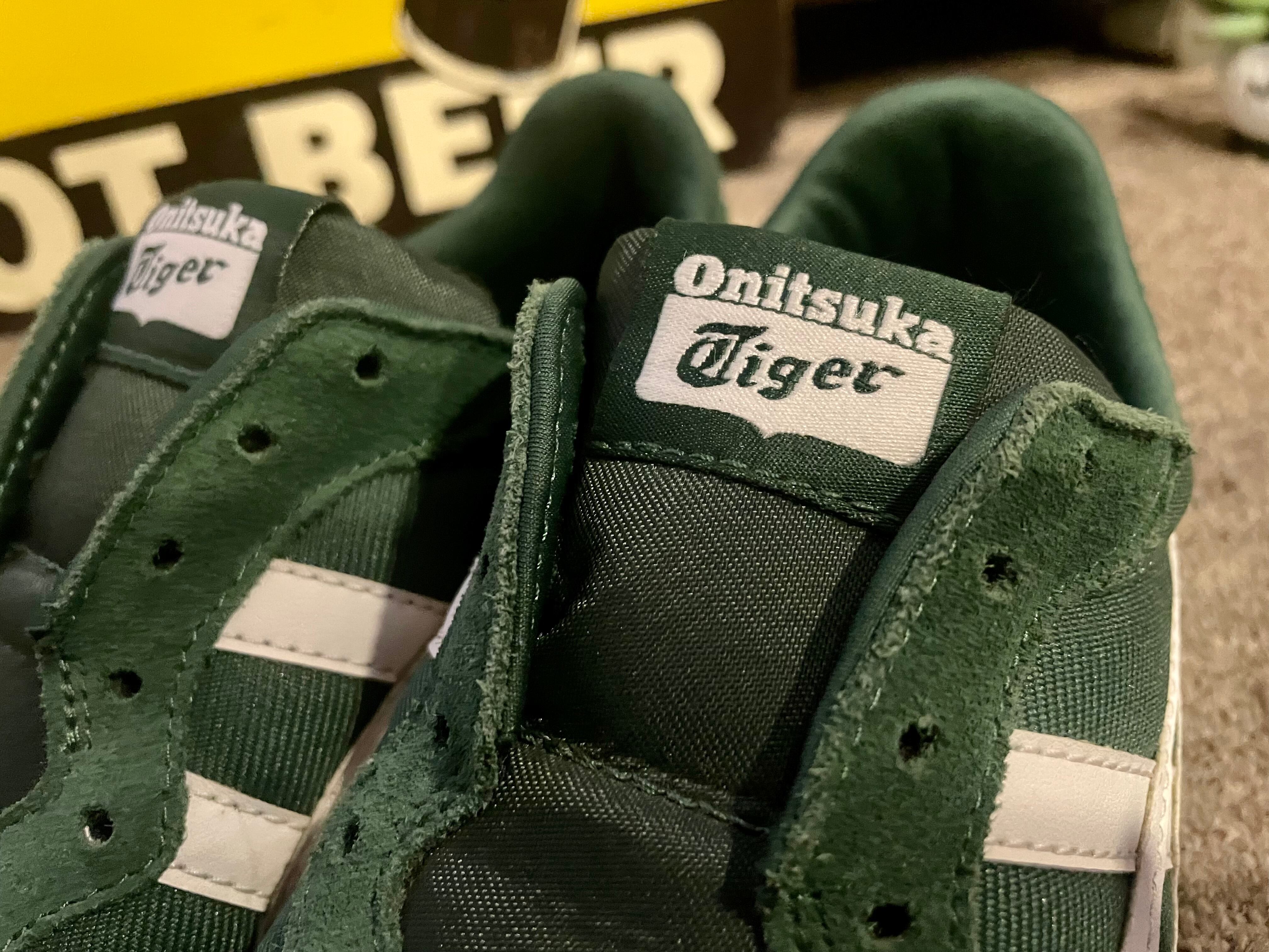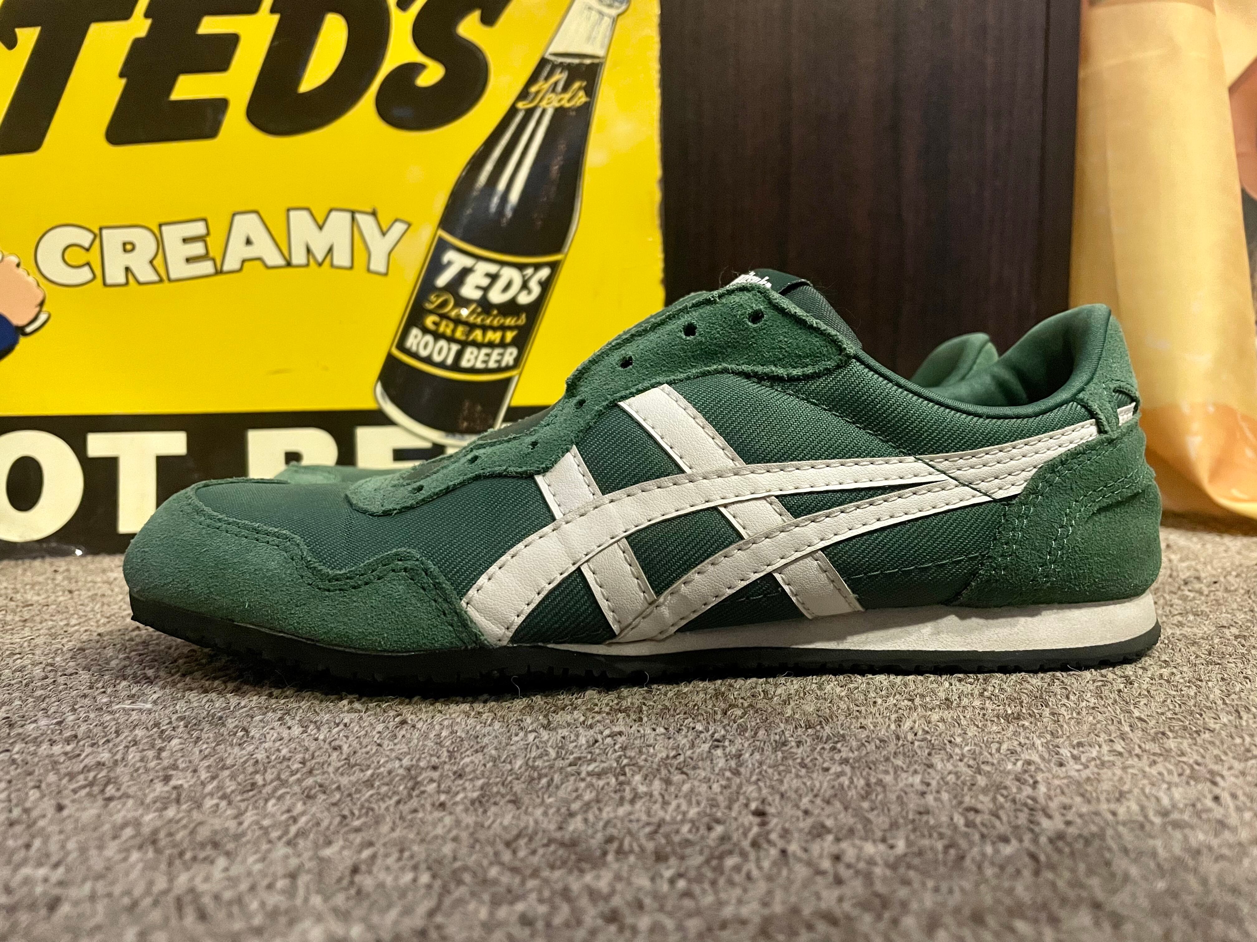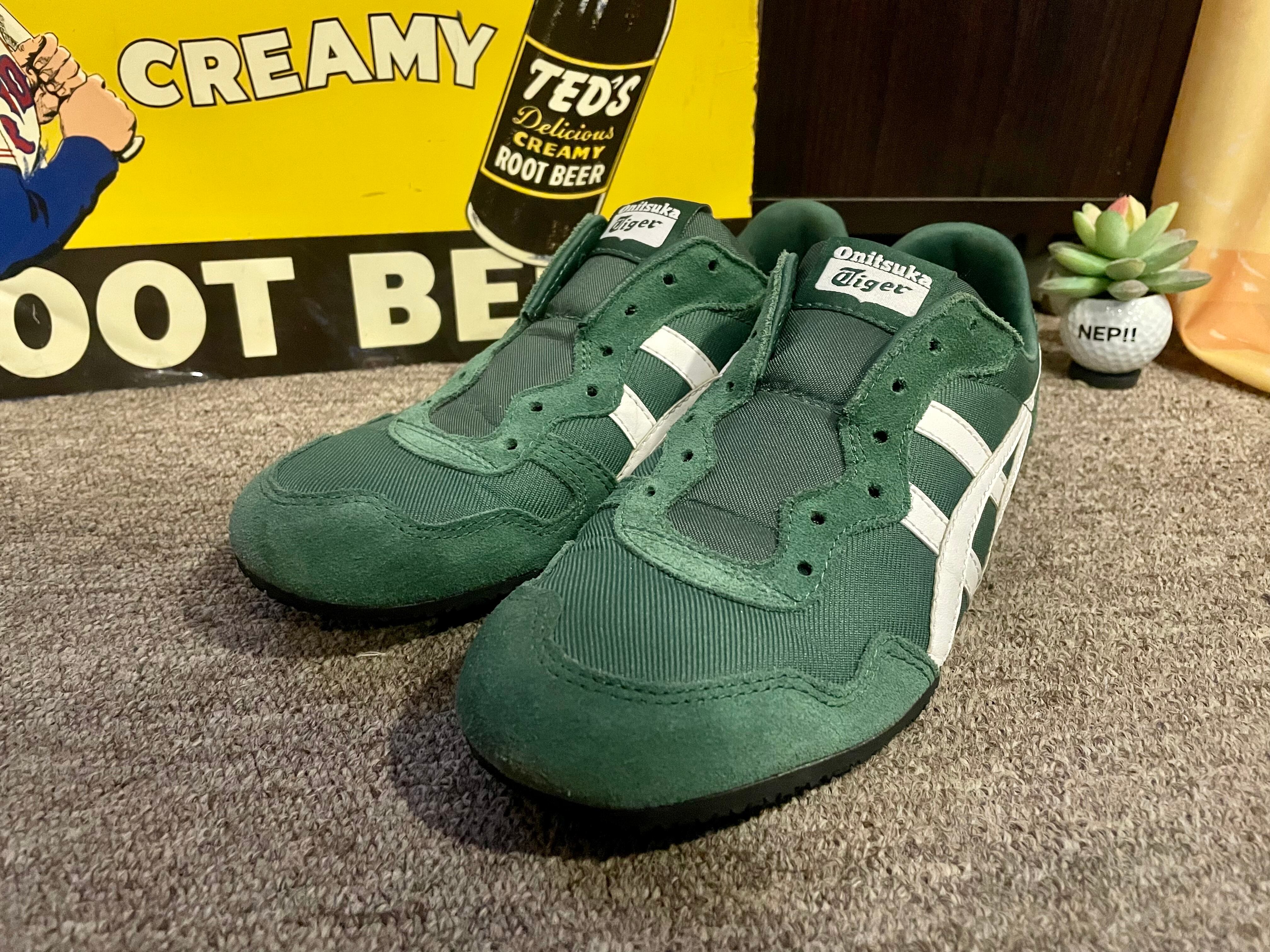 紐なしで履く、スリッポンタイプのオニツカタイガーです。カラーはグリーンで着脱が楽で軽量で履き心地も良いです。