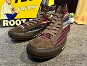 非常に珍しいデザインのコンバースです。ブラウンベースにニットのようなカラフルな横縞のデザインです。つま先部分もスウェード素材となっており、可愛いデザインの一足です。