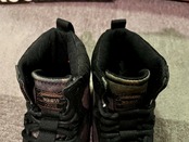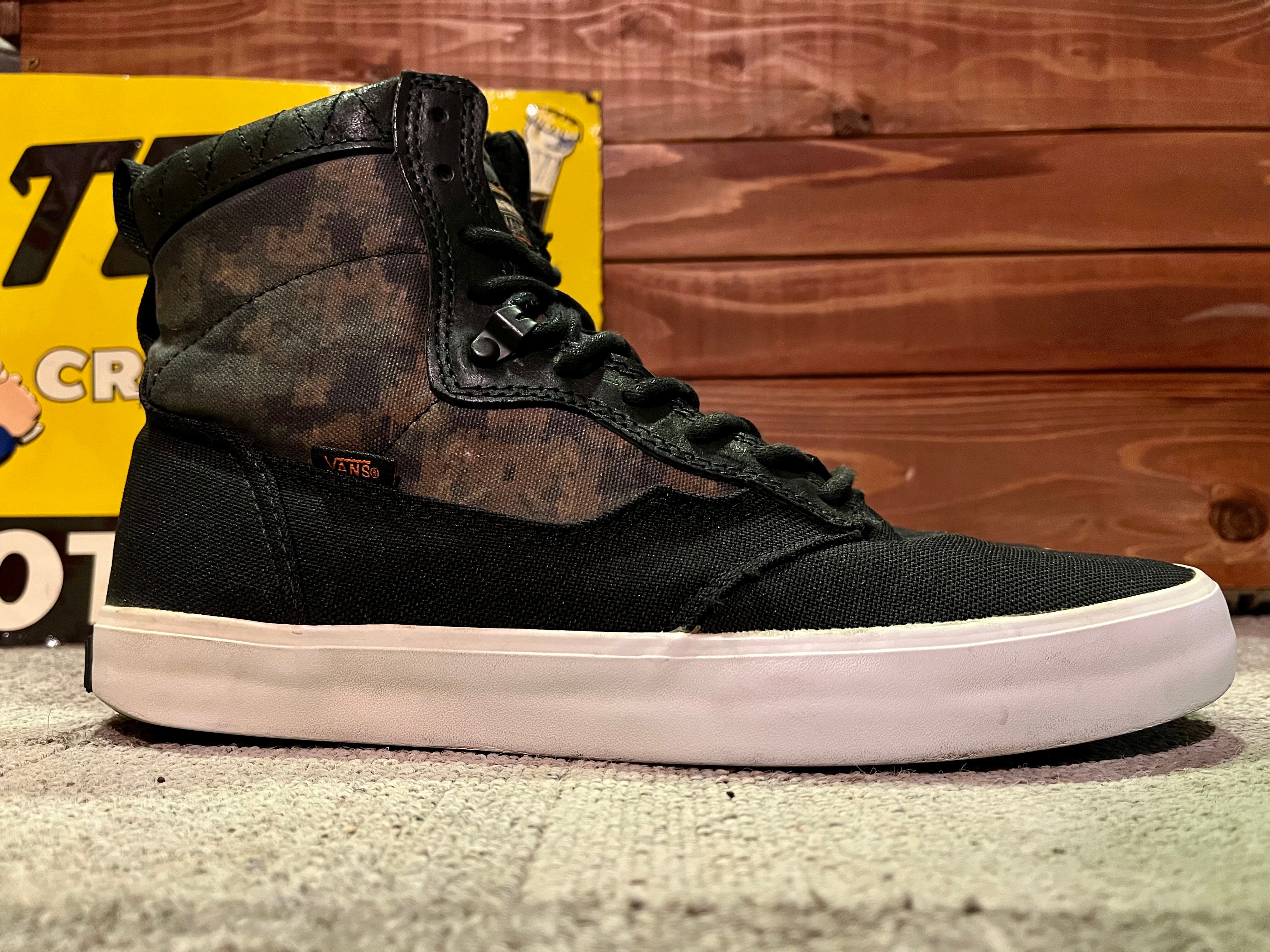 ブラックのキャンバスベースにさりげないカモ柄、形はレースアップブーツのような雰囲気で格好いい一足です。